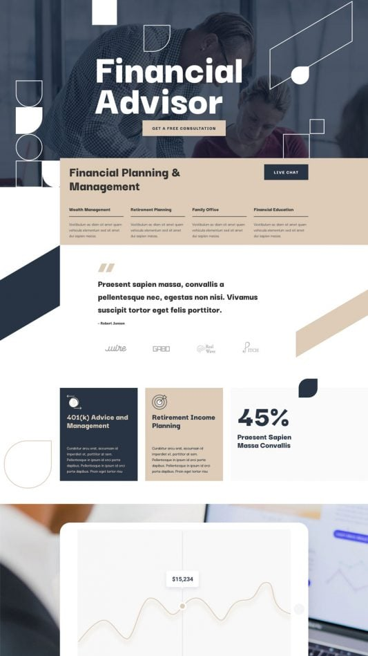 - Универсален шаблон, който е подходящ за бизнес Финансов консултант или подобен тип дейности.